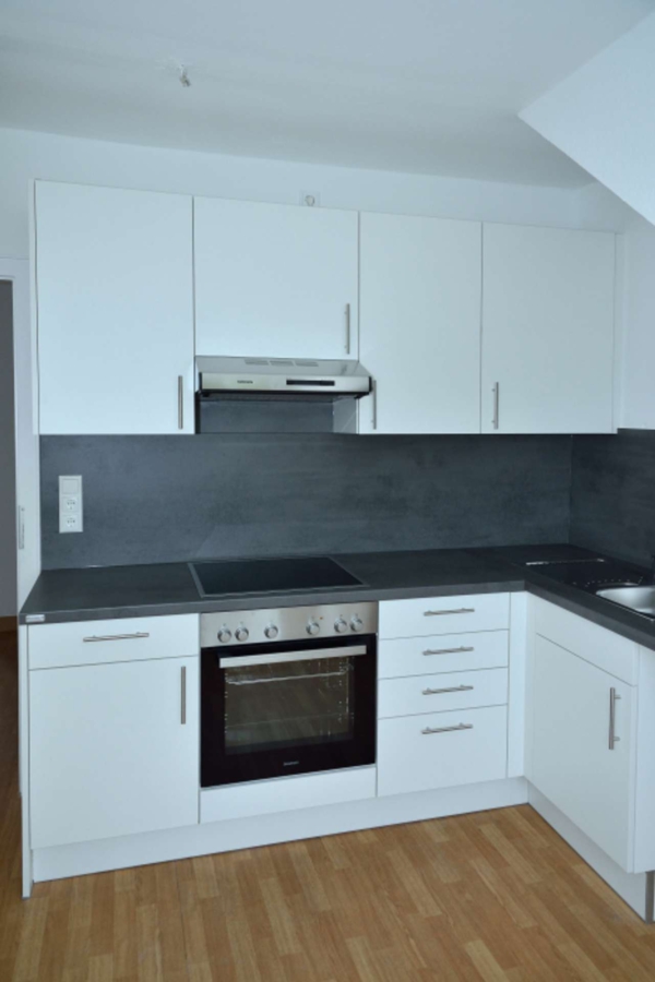 Die neue Einbauküche, mit E-Herd und Dunstabzugshaube sowie Cerankochfeld, bietet ausreichend Platz durch die Ober- und Unterschränke. Mieterseitig können unterbaufähige Geräte integriert werden, entsprechende Wasseranschlüsse sind vorhanden.