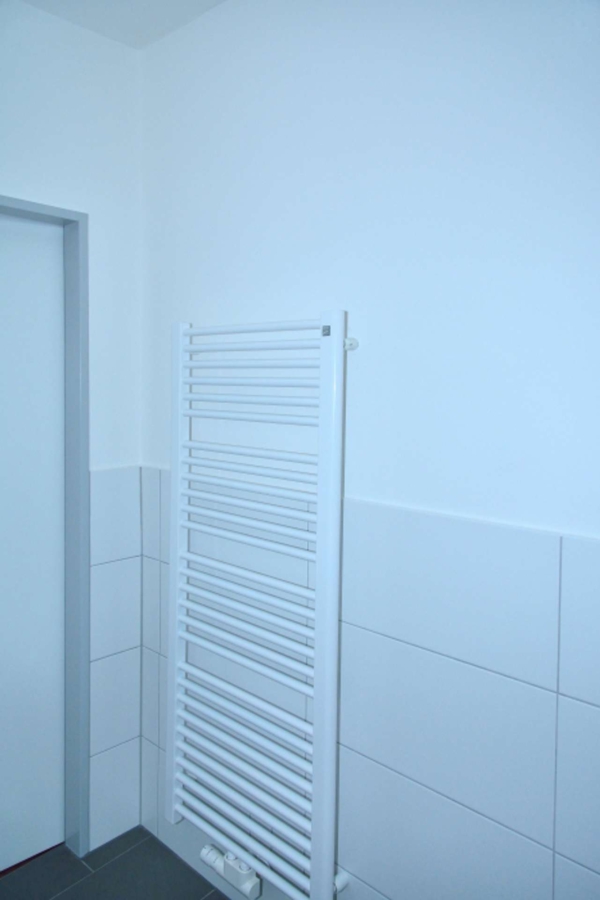 Das Duschbad ist weiß/grau gefliest und verfügt über Sanitärobjekte in Vorwandinstallation sowie einen Handtuchheizkörper. Auch die Küche ist weiß/grau gefliest. Alle übrigen Fußböden sind mit hochwertigen CV-Belägen in Holzoptik ausgestattet.