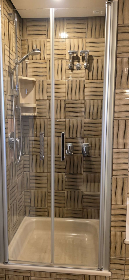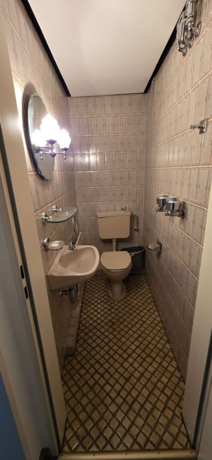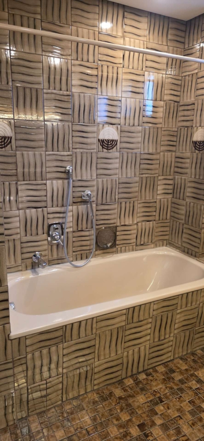Das Badezimmer ist mit dunkel gemusterten Fliesen sowie roséfarbenen Sanitärobjekten versehen und verfügt sowohl über eine Badewanne als auch eine separate Dusche. Ergänzt wird die Ausstattung durch ein separates Gäste-WC.