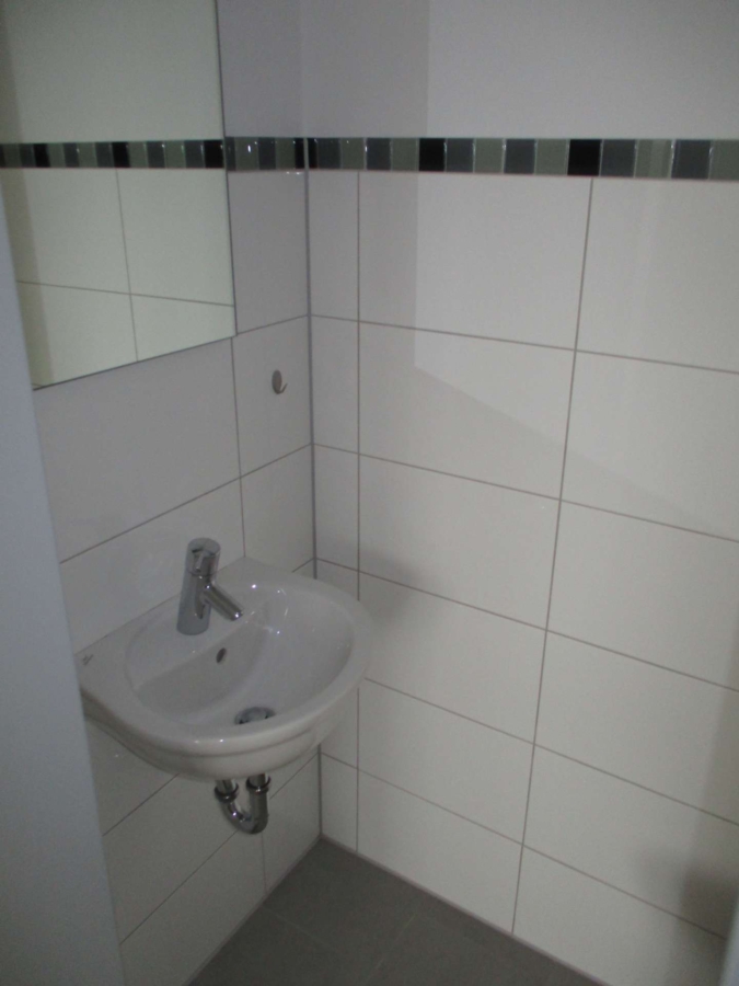 Sowohl das Gäste WC als auch das großzügige Badezimmer sind mit weißen Wandfliesen belegt. Die in grauen Farbtönen dazugehörigen Glas-Mosaik-Bordüren harmonieren ansprechend mit den grauen Bodenfliesen. Das Bad verfügt über eine Dusche und einen kleinen Vorsprung über dem Hänge-WC, der sich optimal als Ablage nutzen lässt. Auch gibt es hier die Möglichkeit, eine Waschmaschine anzuschließen.