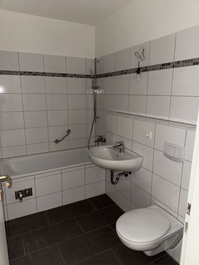 Das Badezimmer, welches 2010 saniert wurde, ist mit Wanne und zusätzlichem Waschmaschinenanschluss ausgestattet und mit grauen Bodenfliesen und weissen Wandfliesen mit einer Mosaik-Bordüre gefliest.