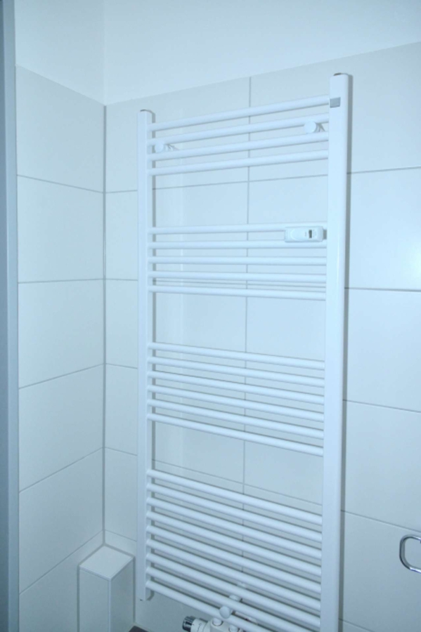 Das Bad wurde modernisiert und mit einer Dusche, einem Handtuchheizkörper und modernen grauen Fliesen ausgestattet.