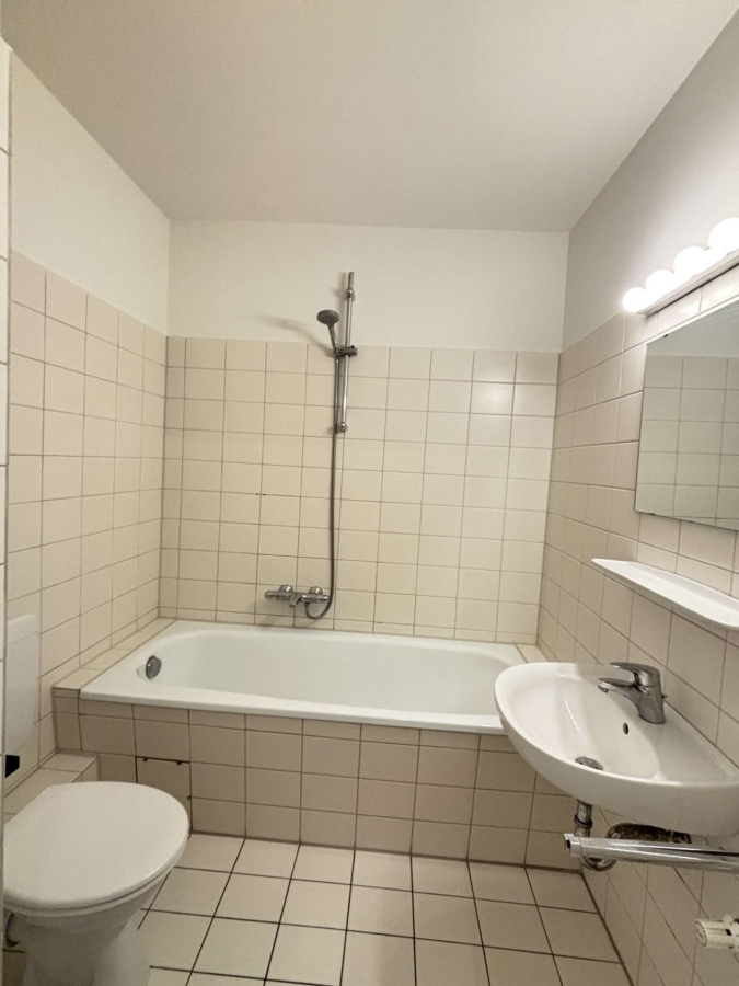 Das Badezimmer mit Wanne ist an den Wänden und dem Fußboden hell gefliest und verfügt über einen Waschmaschinenanschluss.