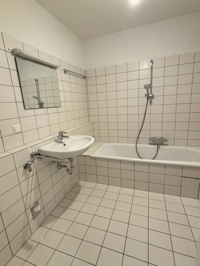 Im Bad ist der Fußboden sowie die Wände hell gefliest. Weiße Sanitärobjekte runden das Bild ab. Ebenfalls ist hier ein Waschmaschinenanschluss vorhanden.